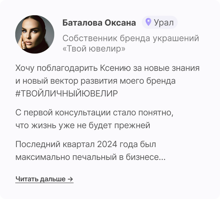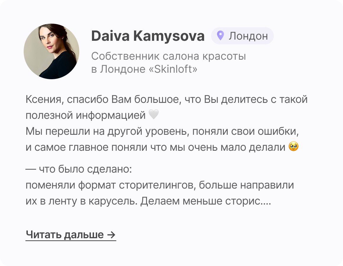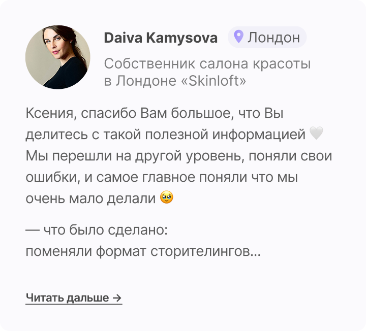 Ну и вишенка на торте, я чувствую, как изменилась и продолжаю меняться сама, становлюсь эффективнее и проявленнее. У меня ушли сомнения в своем продукте, я убедилась, что он хорош, но просто неправильно подан. Включилась в работу над своим личным брендом, стала вкладывать в ведение соц сетей больше своей личной подачи и ценностей. И вижу, что и сама получаю от этого огромное удовольствие, и что есть пусть небольшие, но очевидные результаты.