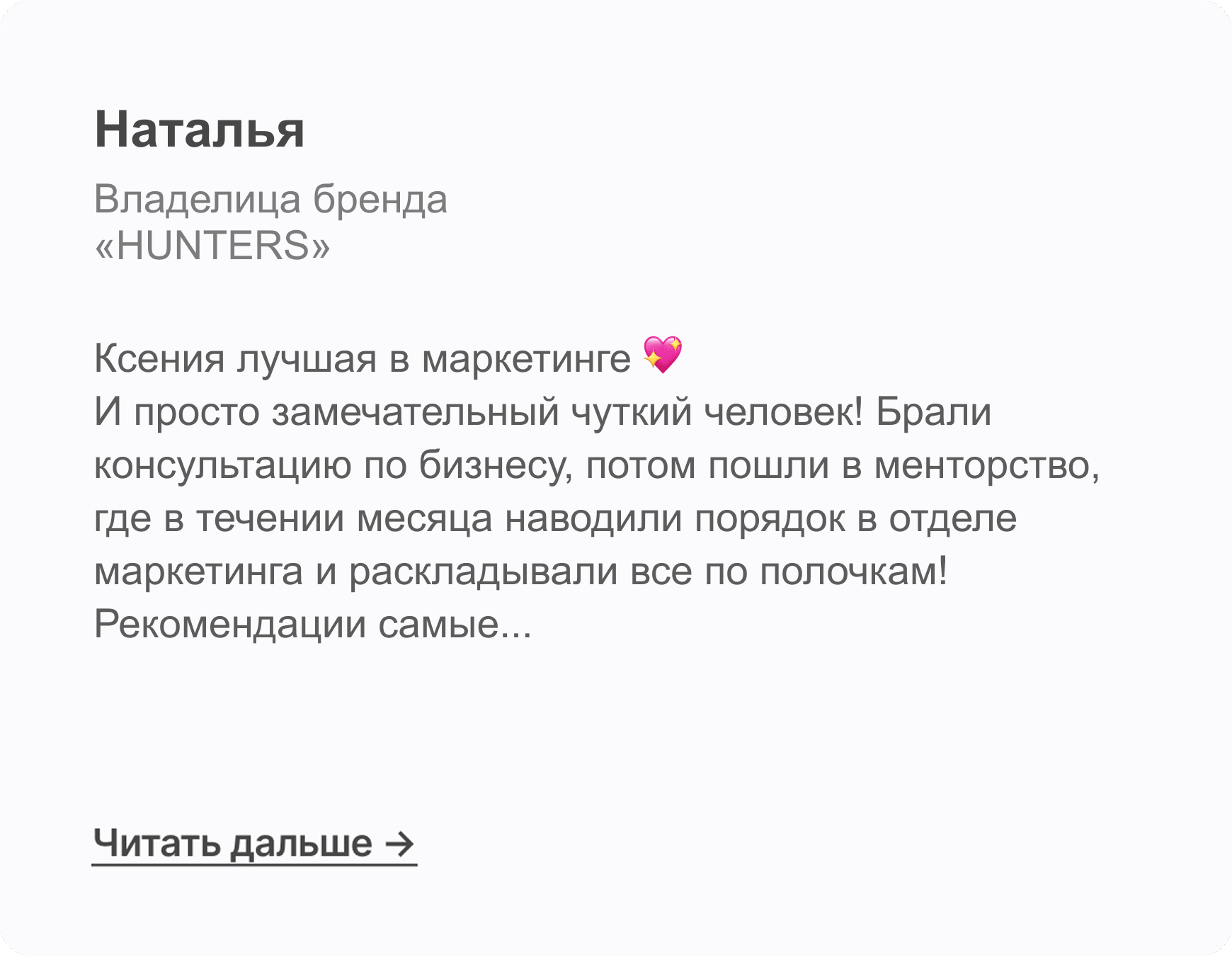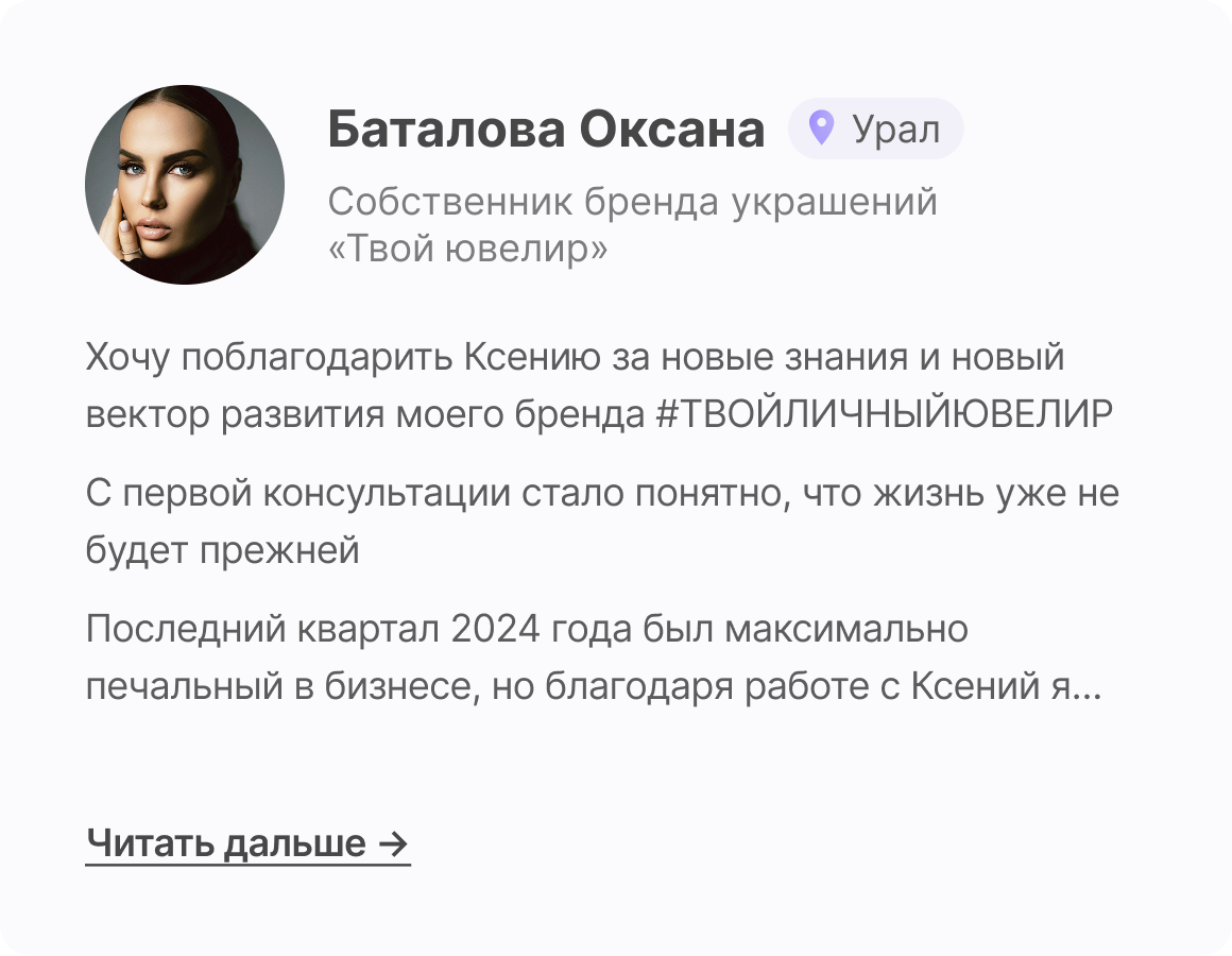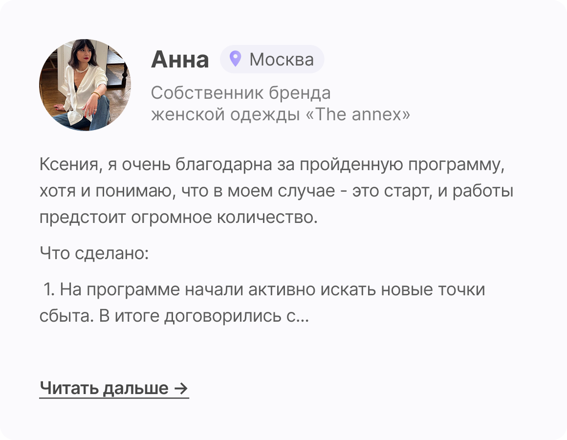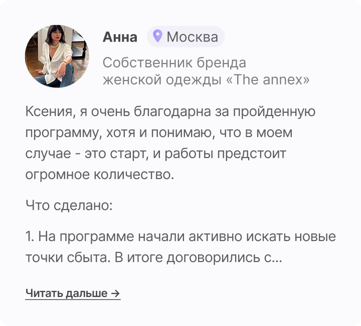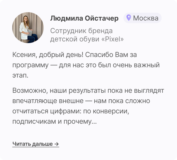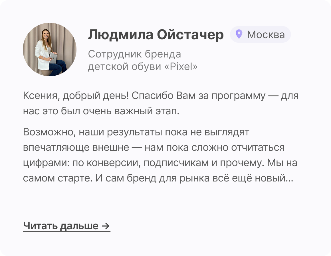 Ксения, я очень благодарна за пройденную программу, хотя и понимаю, что в моем случае — это старт, и работы предстоит огромное количество.