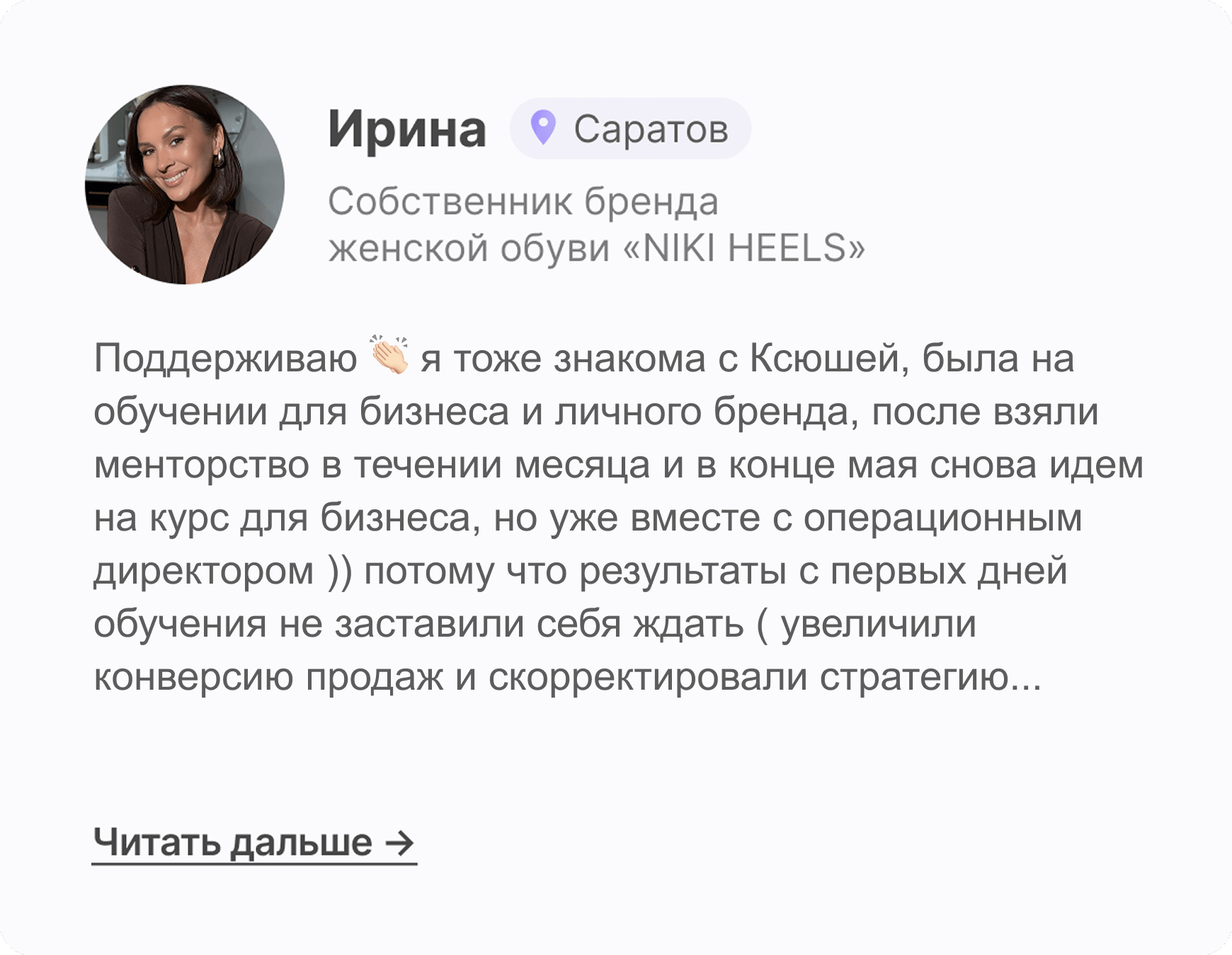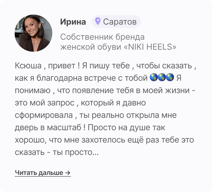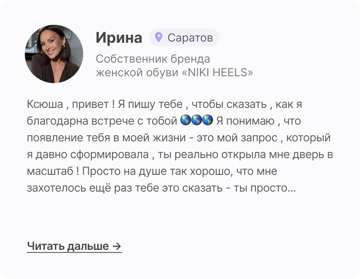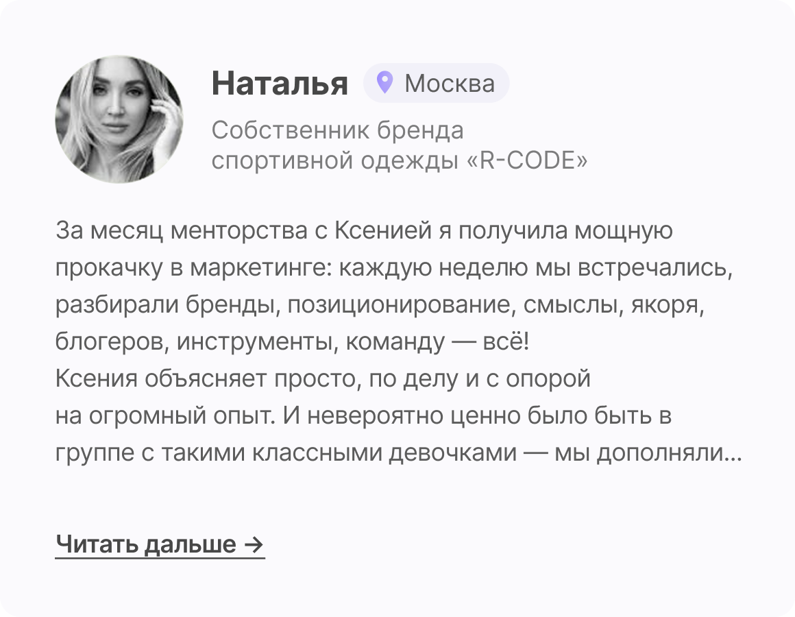 Я жалею только об одном, что я не попала на менторство на самом старте своего проекта. Тогда я смогла бы избежать множества ошибок и гораздо раньше получить результат без бессмысленного слива бюджета.